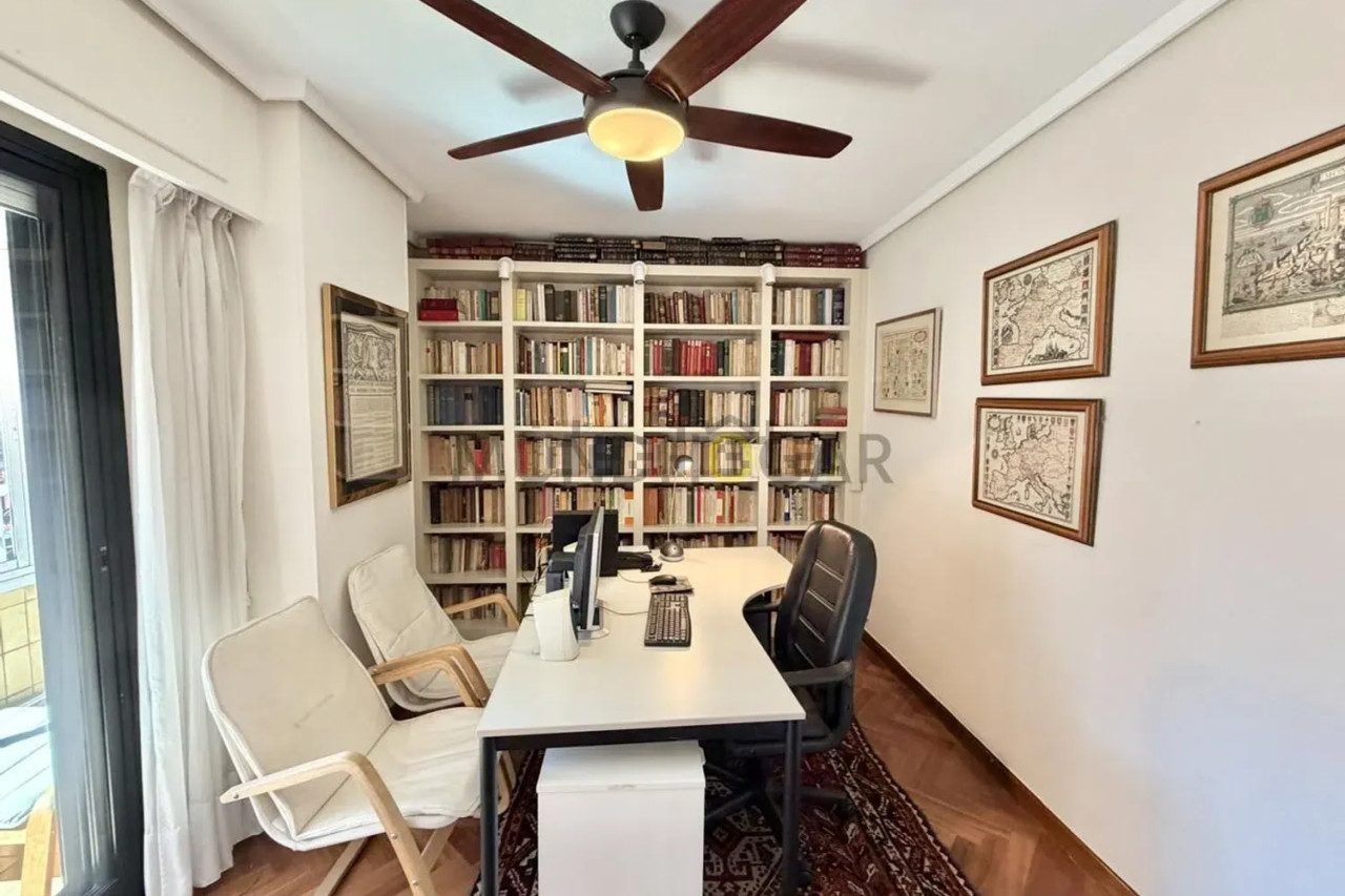 - Gran salón orientado al oeste con estanterías de madera a medida y acceso a terraza abierta.