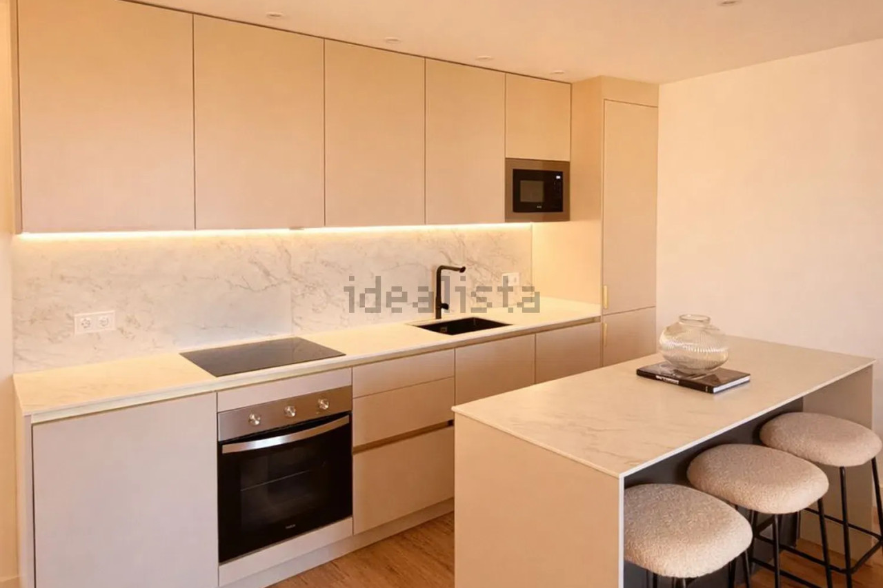 • Cocina americana de diseño con isla central, encimera DEKTON by Cosentino y electrodomésticos integrados de alta gama (placa, horno, campana, microondas, frigorífico, lavavajillas y lavadora-secadora).